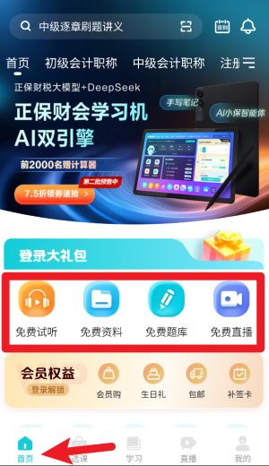 2、首页整合了免费试听、资料、题库和直播功能,用户可点击图标进入相应模块,获取学习资源。