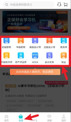 3、在选课页面中可浏览各类财会考试项目图标,点击图标快速进入辅导页,购买相关课程内容。