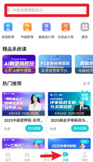4、点击直播,在首页上方的搜索栏输入关键词,如中级逐章刷题讲义,即可快速查找相关课程与资料内容。
