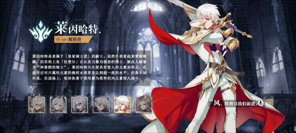 莱因哈特是隶属于[皇家骑士团] 的骑士。虽然外表看起来青涩稚嫩,但实则上是[拉斐尔]公认实力最为强劲的剑士,被众人被誉为“神眷顾的骑士”。莱因哈特天生便具有惊人的元素亲和力,在成年后对六属性元素的操控水准更是达到超一流的水平。但是不知何故,在战场上,他却执着于使用最为柔和的风元素投入战斗。