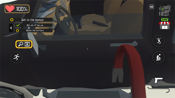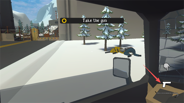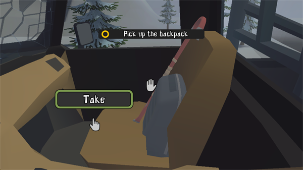 1、进入24号地堡结束剧情,撞车后,视角向右移动,随后点击“Take”,拾取背包和撬棍。