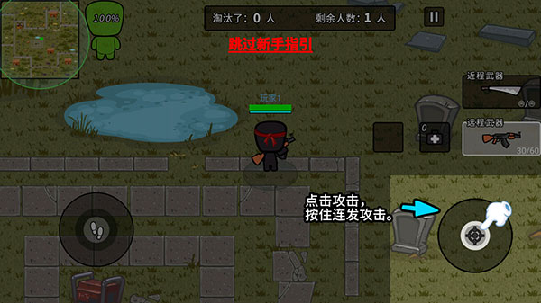 3、降落到地面,左边摇杆拖动控制角色移动,上方小地图绿色圈内为安全区,圈外为中毒区域;