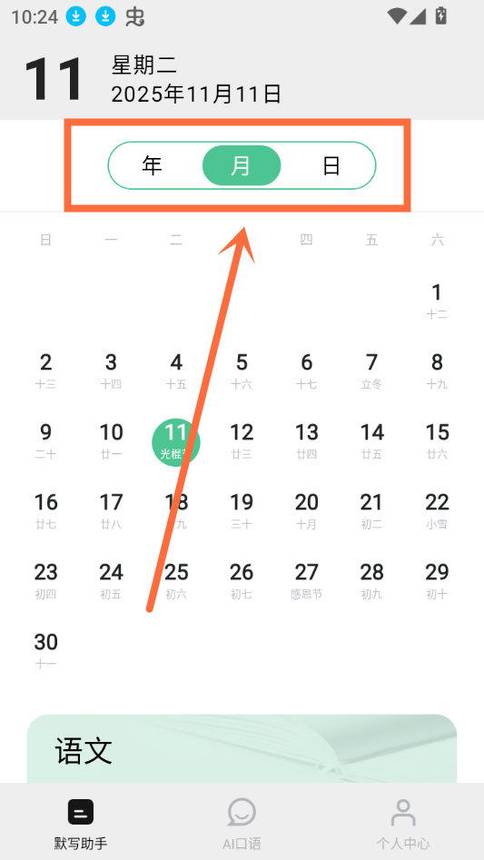 1、打开默写助手应用进入主页面,设置年月日,用于记录每日默写情况。