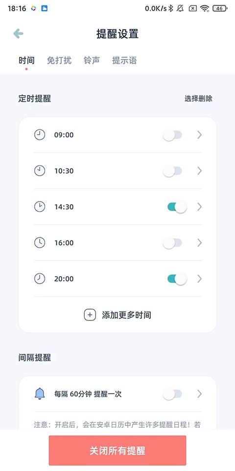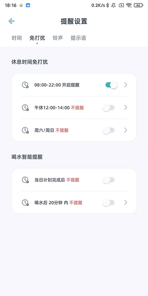 3、选择免打扰模式,还能关闭自定义时段内的喝水提醒通知。