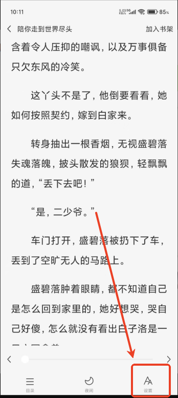 3、进入小说阅读页面后,字体大小、背景颜色、翻页模式等均可按个人喜好自由调整。