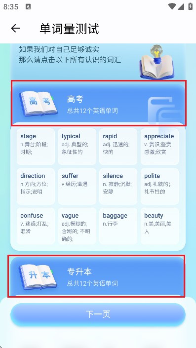 3、任意选择一项功能点击进入,以单词量测试为例,点击对应按钮就能即刻开始测试;