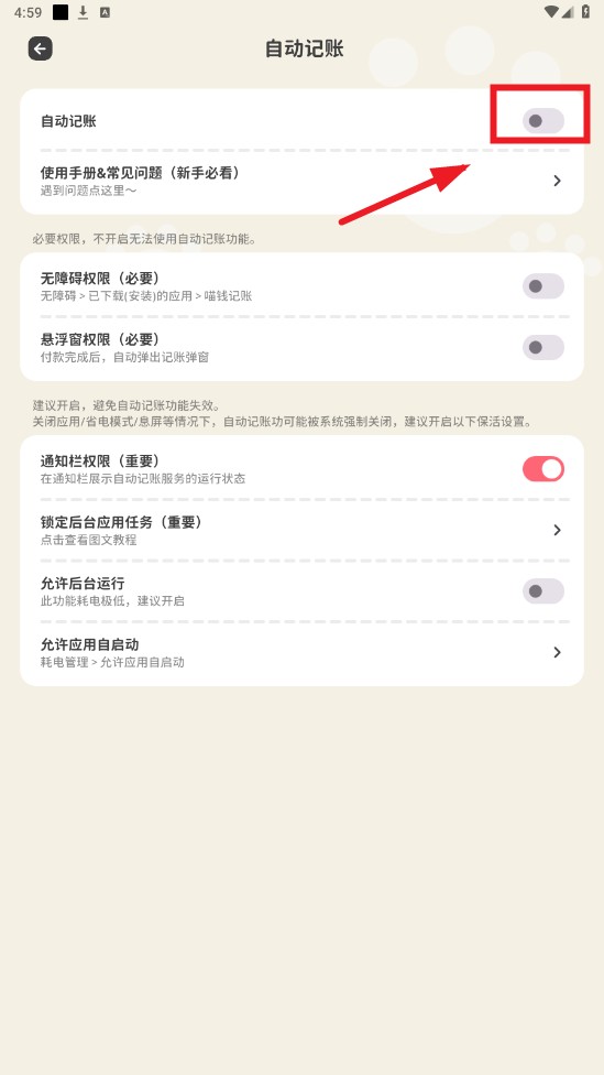 3、勾选或点击 “开启自动记账” 功能按钮,确认启用该服务;