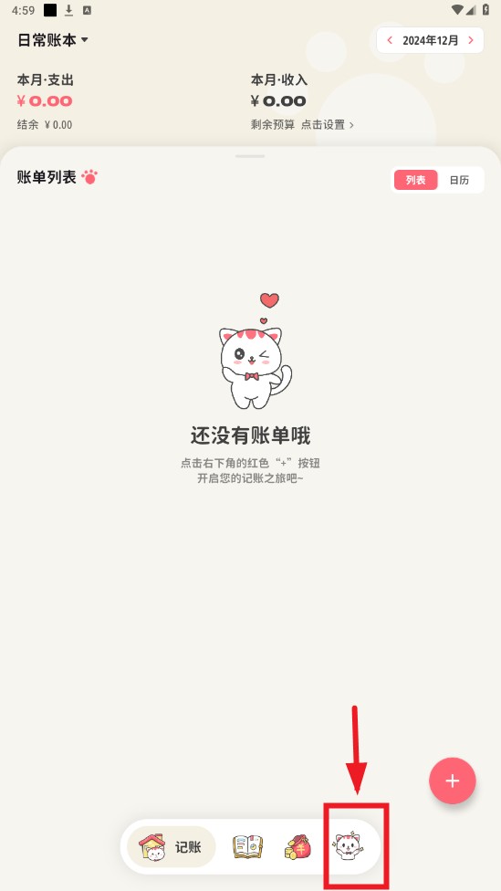 1、启动喵钱记账安卓版,点击底部猫咪图标,进入个人中心界面;