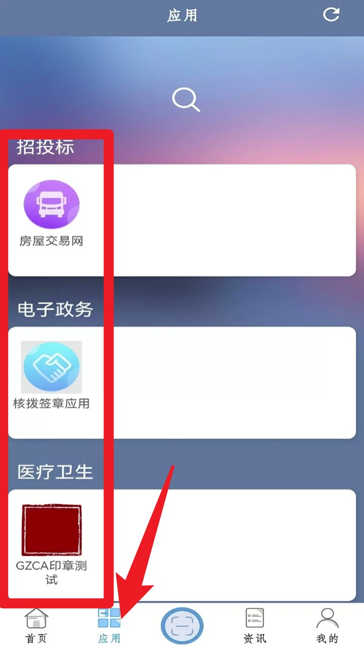 1. 在下方点击应用进入功能页,可选择招投标、电子政务、医疗卫生等模块,点击图标进入子系统。