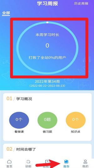 3、点击底部报告选项进入学习周报页面,即可查看本周学习时长、练习数量与知识掌握情况。