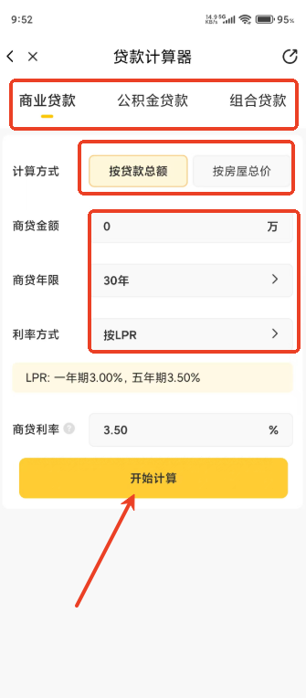 3.可以自由选择商业,公积金或者组合贷款,输入金额与相关信息就可以开始计算了。