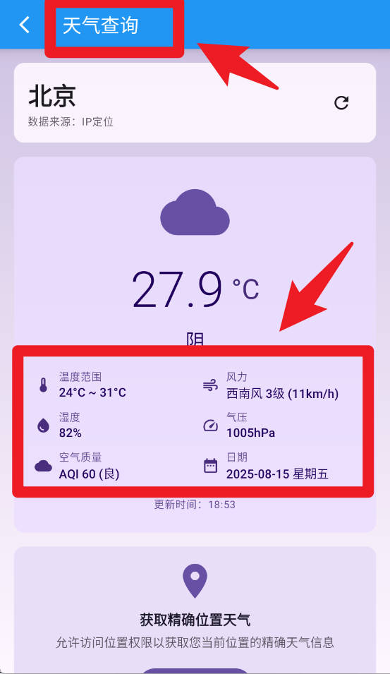 4、通过天气查询可查看所在地实时温度、湿度、风力及空气质量等详细信息。