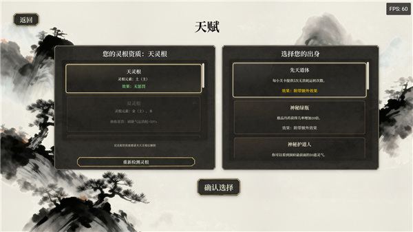 2、在正式开始游戏前,还要选择天赋,包括灵根和出身,灵根会影响对应属性灵气的修炼效益,多灵根也会带来相应的负面效果限制,出身则会提供额外效果。