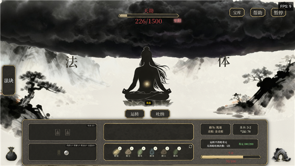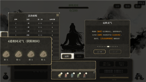 3、玩家通过选择灵气运转来获得修炼进度,法诀可以为修炼提供不同的倍率加成,玩家可以通过选中并点击吐纳刷新掉不需要的灵气,也可以通过刷新按钮直接刷新所有丹田中的灵气。