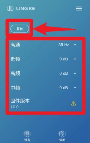3、在设备设置页可手动调节音箱的高通、低频、高频和中频参数,并支持固件检测与一键复位。