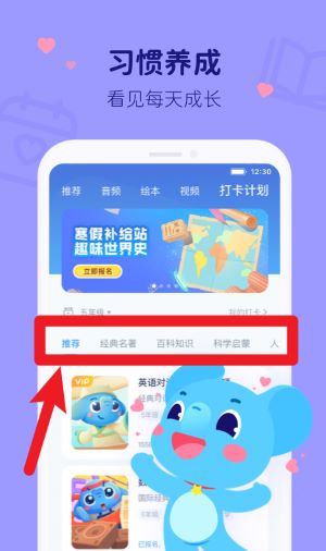 3、点击推荐、名著、百科等分类栏目,孩子可根据兴趣选择不同类型的阅读或听书内容。