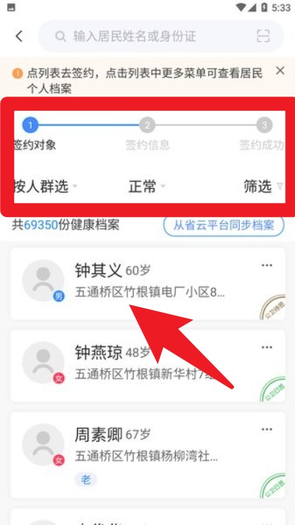 3. 在签约流程中选择目标居民或家庭成员,点击姓名查看或录入健康档案。