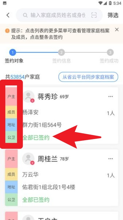 4. 查看家庭档案时可根据户主、成员、地址、公卫等标签判断签约状态。