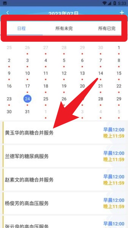 5. 切换到工作页可查看日程任务,点击居民服务项进入随访或签约操作界面。