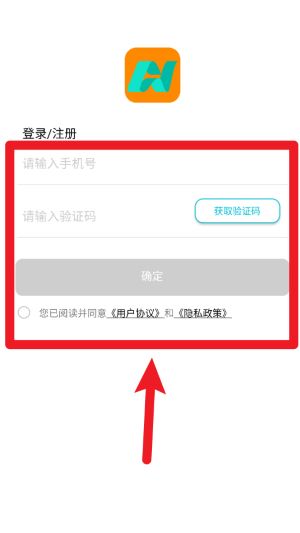 1、打开应用后,输入手机号获取验证码登录,完成注册并勾选同意用户协议和隐私政策。
