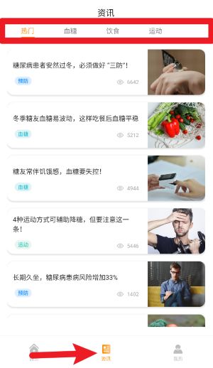 3、点击底部资讯栏目,可阅读糖尿病相关的热门、血糖、饮食和运动等健康文章。