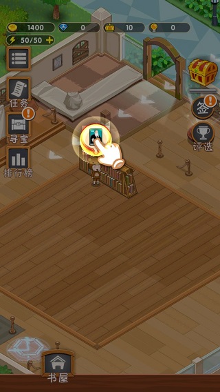 2、点击“书屋”,在这里建造基础设施,先购置一个简易书架。通常客人进店,会在书架寻找他想要的书籍。客人的想法总是很多,如果他们找不到书籍,可是会生气的。