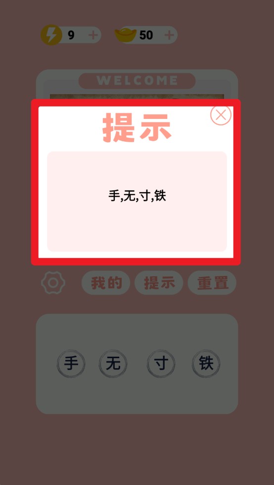 3、点击提示按钮后会弹出关键字,帮助用户快速猜出正确答案。