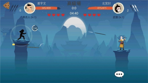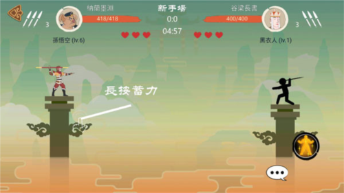 4、进入游戏后,可以看到双方各持一方,使用标枪来进行攻击,先倒下的人就算输了,需要通过长按屏幕来蓄力,向不同的方向移动则可以改变标枪的发射角度,这样可以决定攻击的位置,集中头部可以获取大量的血条消失术。其次是身体。最主要的还是需要玩家有精准的判断力。