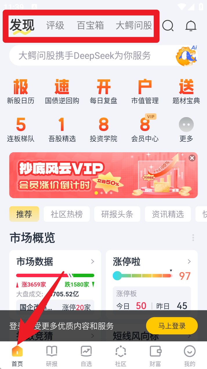 1.打开App默认进入首页,向下滑动可查看市场总览、涨停雷达、新股日历等热门模块,点击顶部发现、评级等栏目可切换更多投资内容。