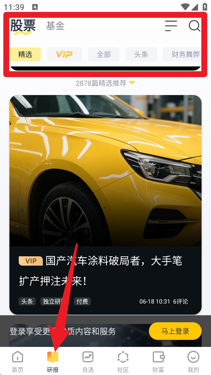 2.点击底部导航栏的研报按钮,进入后可浏览精选、VIP、全部等分类,支持查看每日更新的行业深度分析与个股独立研报内容。