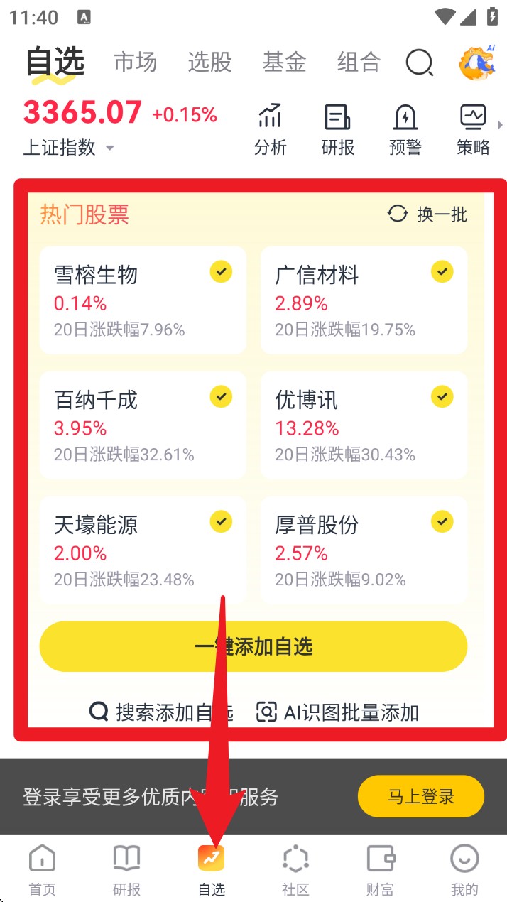 3.切换至自选页面,可查看自选股表现及相关策略数据,点击一键添加或使用AI识图工具快速将目标个股加入到自选列表中。