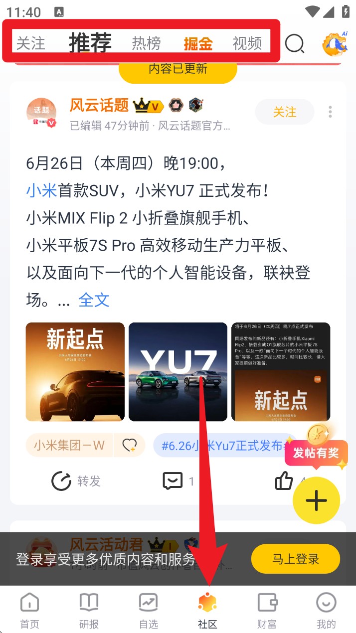 4.进入社区模块可查看实时推荐、热榜与掘金专栏,浏览市场热点讨论贴文,也可发布个人观点与他人互动交流、点赞收藏等。