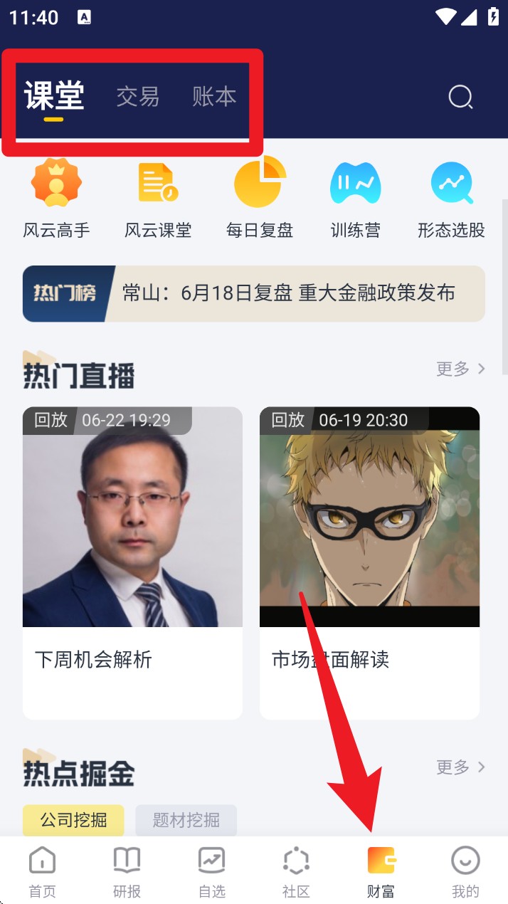 5.点击底部的财富图标,进入课程专区查看风云课堂、每日复盘等内容,也能观看热门讲解直播,提升交易与资金管理技能。