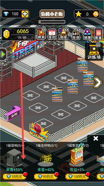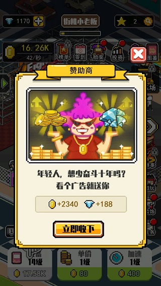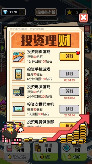 1、整体游戏的升级选项非常的多,普通升级一共有三种,第一种是玩家通过升级场景中的电玩机的数量。第二种则是玩家需要升级电玩机每次使用时的单价,第三种则是玩家升级电玩机每次使用的时间,不过第三个我不太推荐强制升级,这个升级作用不是很大,只需要点击屏幕加快当前的时间就可以结束这个问题。然后科金升级主要是潮牛的各种装饰,这个需要用钻石来买,不过这个钻石他通过看广告场景,各种各样的广告掉落以及一些任务。剧情都可以直接进行获得,而且你可以通过投资钻石来进行利滚利。这个形成循环其实问题不大,所以说对来说,钻石和金币相比而言也就是稍微拿获得的一个货币而已。