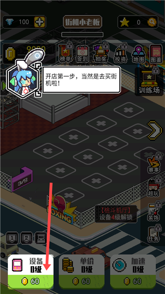 2、游戏开始提示开店第一步是购买街机,在界面下方点击【设备0级】,花费60金币购买初始设备,开启经营。