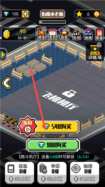 4、当有足够资源时,可考虑购买折扣价540钻石的设施,推进【格斗机厅】等区域解锁,设备达到24级可解锁该区域。