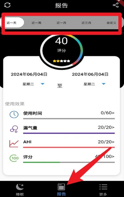 2、点击报告页面可查看评分与各项睡眠数据,并支持按时间段筛选查看。