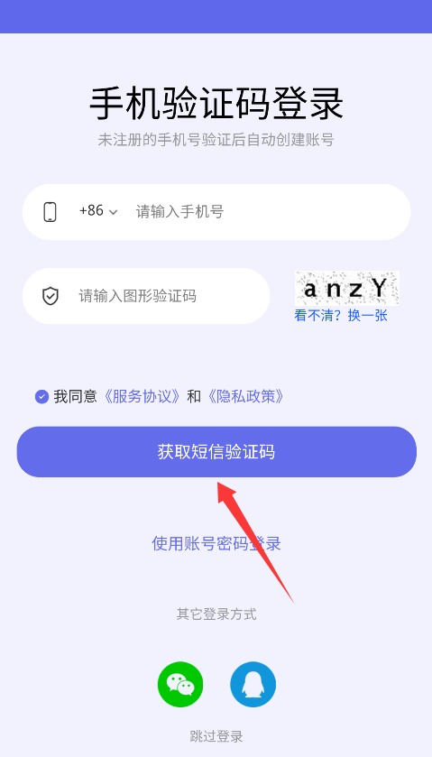 1、输入手机号和图形验证码,勾选同意协议后点击获取验证码并输入登录账号。