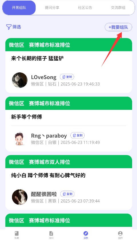 2、进入探索页面点击右上角我要组队按钮,进入房间创建界面准备组队。