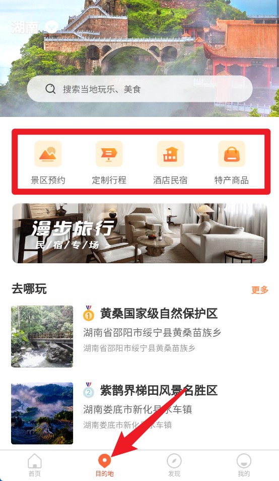 2、点击目的地按钮可查看热门旅游目的地,包含景区名称、地理位置和详细介绍信息。