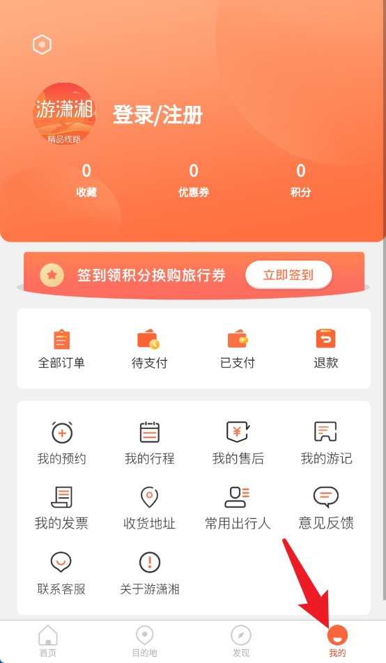 4、点击我的按钮进入个人中心,查看订单、行程、积分、优惠券及售后等个人服务内容。