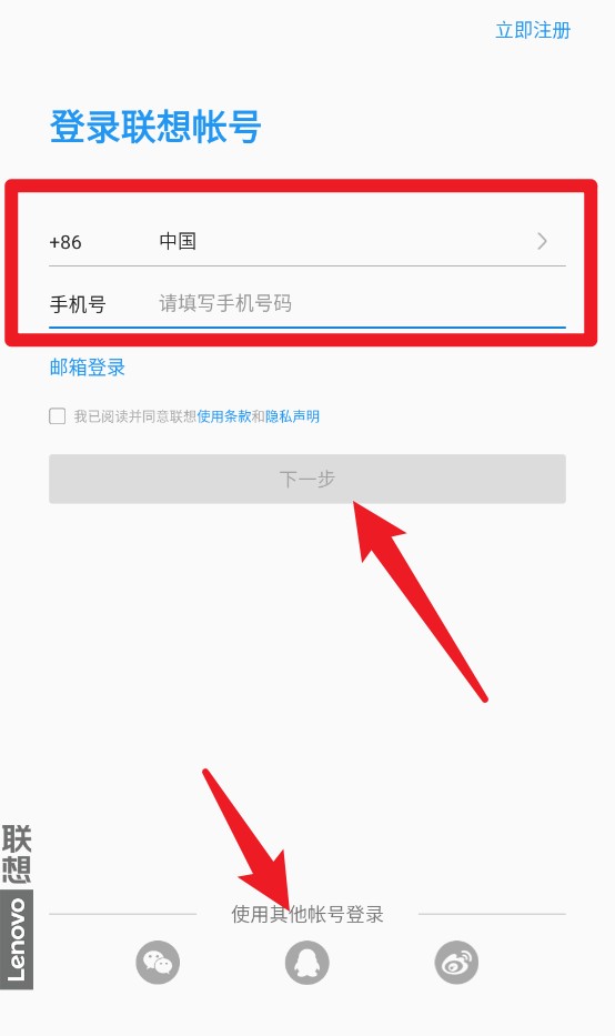 1、登录联想账号需填写手机号并获取验证码,也可选择邮箱或第三方账号登录。