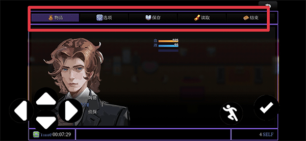 2、进入游戏后,左边操控盘控制角色的移动,右边为奔跑和调查,右上角图标是菜单栏,