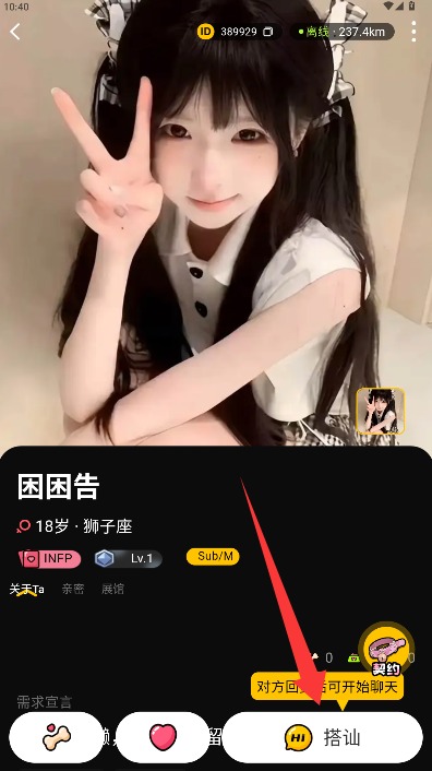 4、进入用户资料页面查看详细信息,点击搭讪功能即可与该用户进行交友聊天。