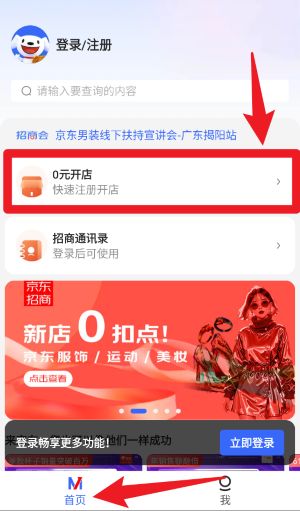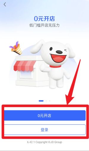 2、在欢迎页面,用户可选择0元开店按钮快速注册新店铺,或通过下方登录入口使用已有京东账号直接进入系统,方便不同身份的商家操作。