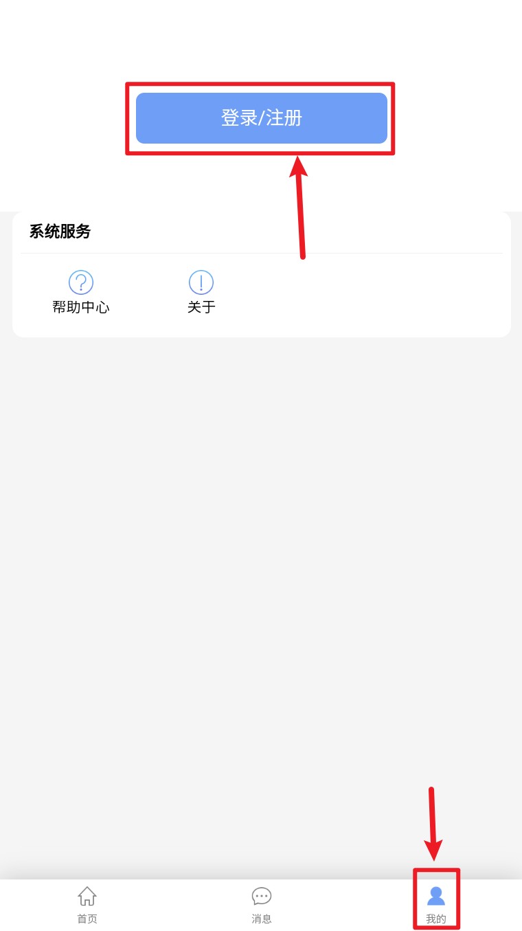 1. 打开App后点击右下角我的,点击蓝色按钮进入登录、注册流程。
