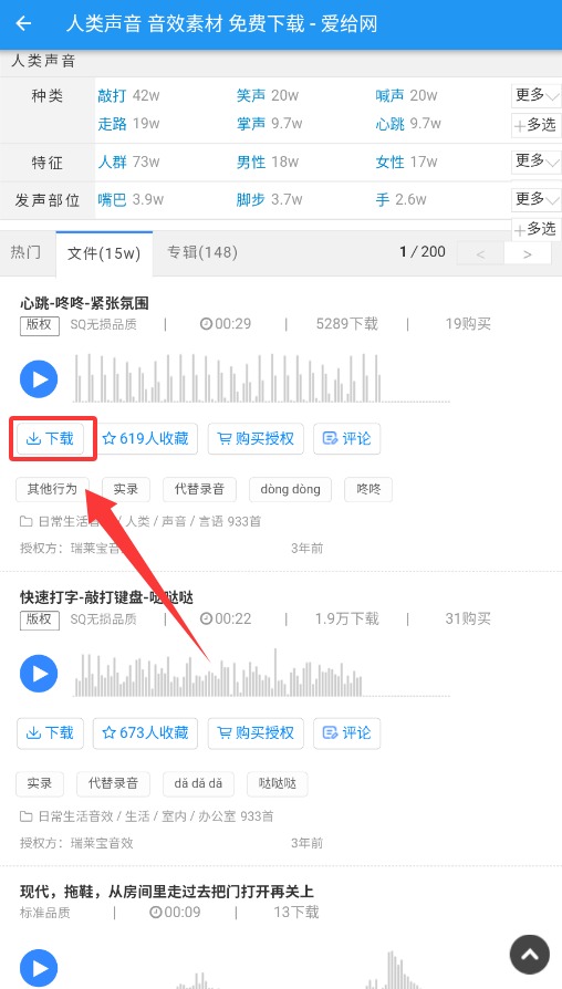 2、浏览搜索结果页面,选中需要的内容后点击下载图标进入文件详情界面。