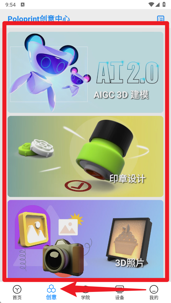4、创意中心包含AI 3D建模、设计和3D照片等功能,支持多种创作方式。
