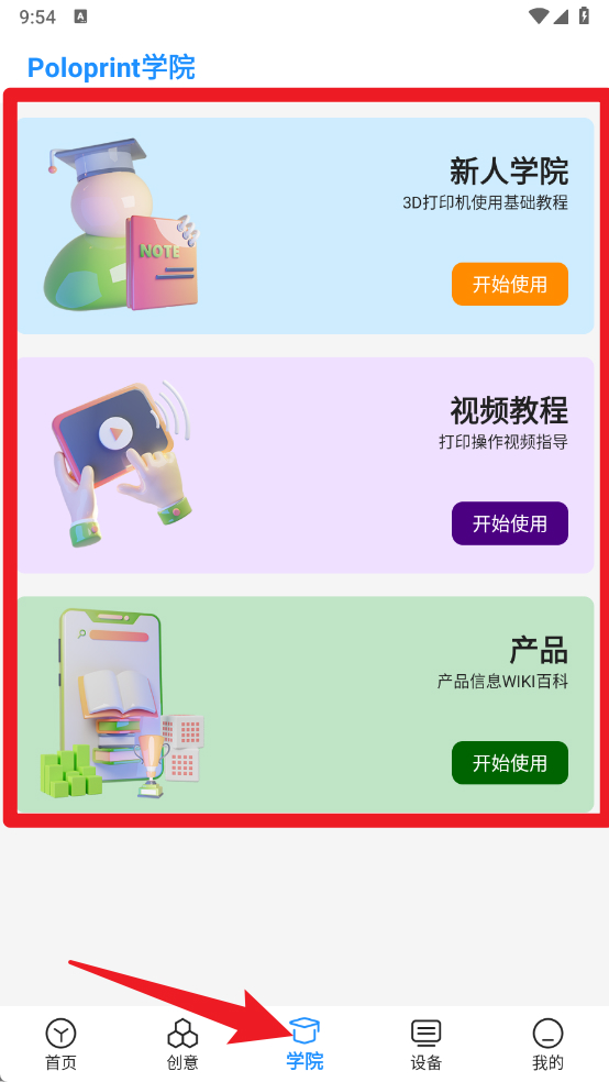 5、学院板块内有新人学院、视频教程和产品百科,帮助用户学习打印与设备知识。