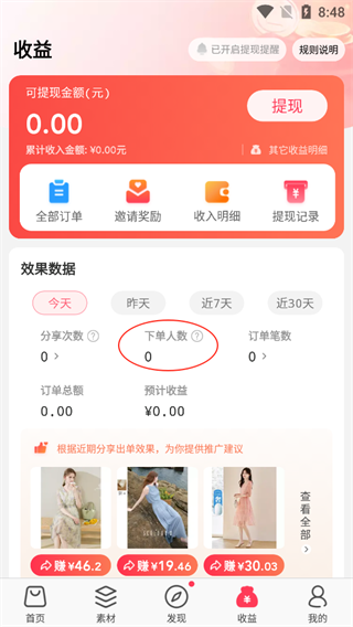 5、点击收益板块,可查看下单人数及预估收益情况。